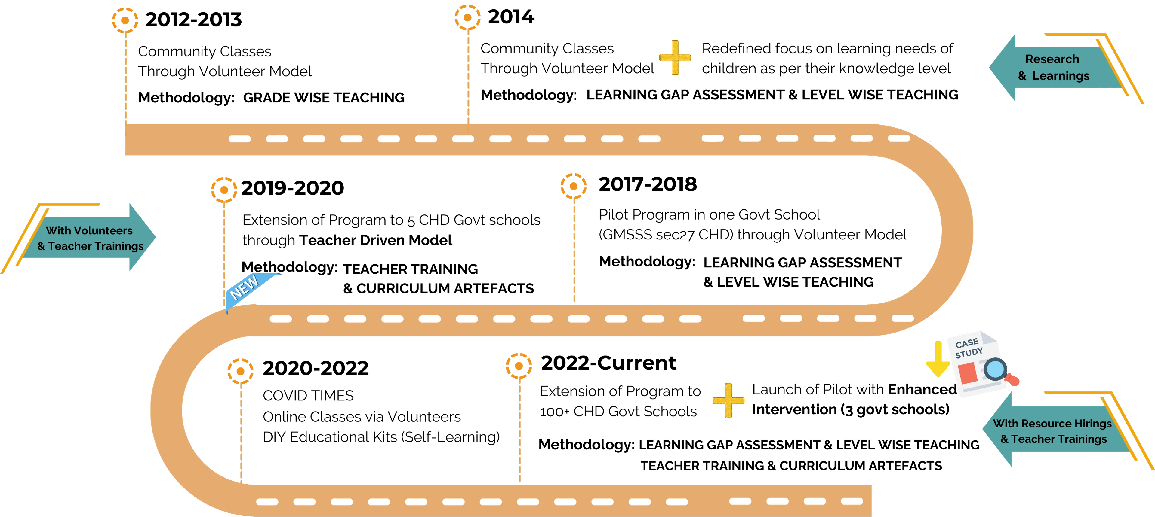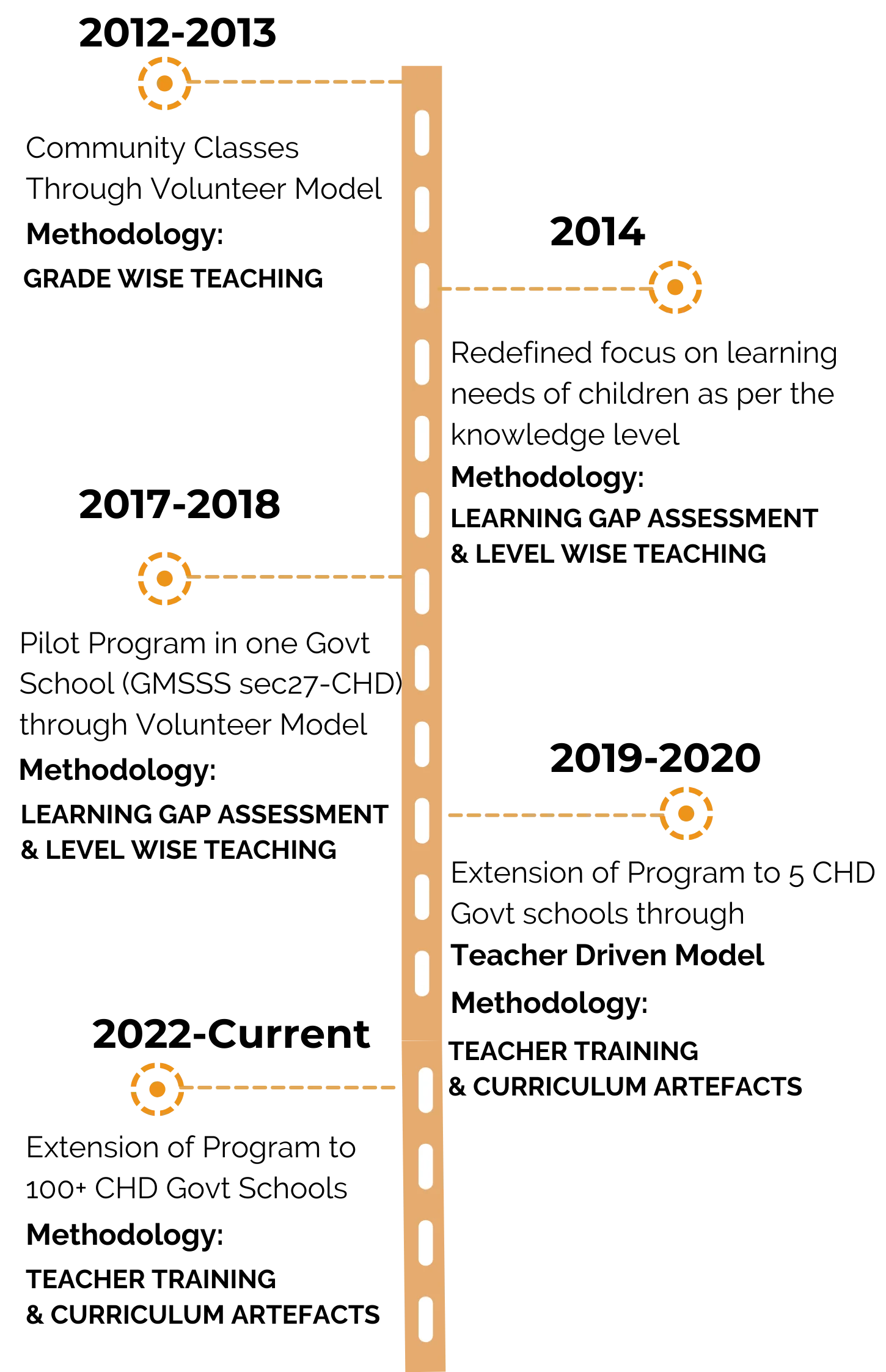 In November 2012, our team initiated the Paathshala Program in Chandigarh urban slum, addressing the unique challenges faced by children in this environment. What started as a local initiative, through children’s context, household problems, school environment and regular feedbacks has grown into a transformative educational model.